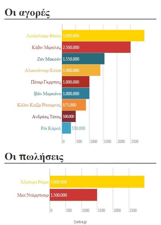 * Κάποιες κινήσεις του χειμώνα επηρεάζουν εμφανώς το μεταγραφικό ισοζύγιο της επόμενης σεζόν. Τρανό παράδειγμα ο Ιανουάριος του 2014, όταν ο Ολυμπιακός παραχώρησε Κώστα Μήτρογλου και Βλάντιμιρ Βάις έναντι σημαντικού αντιτίμου και το καλοκαίρι του ίδιου έτους έδωσε πάνω από 23.000.000 ευρώ σε αγορές