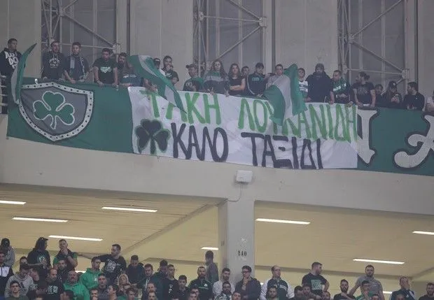 Οι φίλοι του “τριφυλλιού” δεν ξέχασαν τον παλαίμαχο και αδικοχαμένο άσο, ανεβάζοντας ένα μεγάλο πανό με το μήνυμα: “Τάκη Λουκανίδη, καλό ταξίδι”.