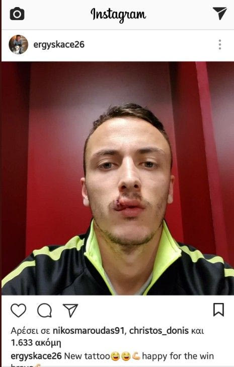 Ο Αλβανός μέσος έκανε οκτώ ράμματα στο χείλος του αφού αντίπαλος τον χτύπησε άθελόα του στο συγκεκριμένο σημείο κατά τη διάρκεια του αγώνα.