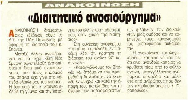 Η… “Σπανιάδα” κράτησε για αρκετό διάστημα μέχρι να έρθουν άλλα ματς που σήκωσαν νέες θύελλες διαμαρτυριών (όπως εκείνο το παιχνίδι του Παναθηναϊκού στην Καλαμάτα και το πέναλτι που κέρδισε ο Βαζέχα). Ο Πανιώνιος στο τέλος της σεζόν δεν γλίτωσε τον υποβιβασμό, αλλά η επιστροφή του ήταν άμεση. Κι επειδή η εκδίκηση είναι ένα πιάτο που τρώγεται κρύο, το 1998 έστειλε τον Παναθηναϊκό στα… τάρταρα, κατακτώντας το Κύπελλο στον τελικό του “Γ. Καραϊσκάκης”. Οι “πράσινοι” ήταν ήδη στις πρώτες σελίδες των δικών τους “πέτρινων χρόνων”…