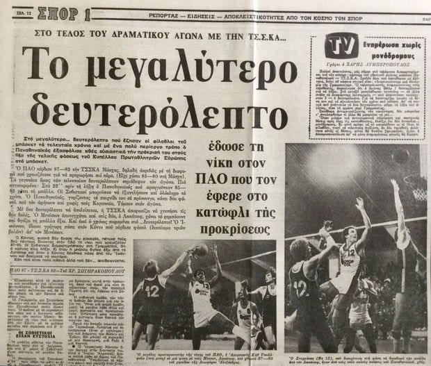Στο γήπεδο ήταν και ο διαιτητής Κώστας Δήμου που έλεγε στο τέλος. ‘Ο Απόστολος Κόντος σήμερα ήταν επαγγελματίας του ΝΒΑ και με δεμένα μάτια, θα τις έβαζε τις βολές’. Ήταν από τα καλύτερα και πιο συγκλονιστικά παιχνίδια που έζησα στην καριέρα μου. Πριν από τον αγώνα, κανένας δεν πίστευε ότι μπορούσαμε να αποκλείσουμε την ΤΣΣΚΑ, που αποτελούσε τη βάση της τότε Σοβιετικής Ένωσης, με Μίσκιν, Ερέμιν, Λοπάτοφ, Ταρακάνοφ στη σύνθεσή της και η οποία πριν από λίγους μήνες είχε στεφθεί Παγκόσμια πρωταθλήτρια στην Κολομβία”.
