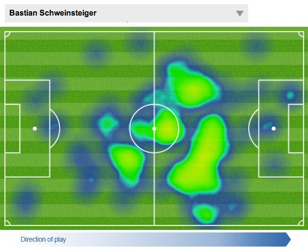 Καθόλου τυχαία, ο Σβαϊνστάιγκερ ανέβηκε περισσότερο στο 2ο ημίχρονο. Καθόλου τυχαία η πρώτη επίθεση της Μπάγερν στην επανάληψη είδε τον Σβαϊνστάιγκερ να πατάει περιοχή και να σουτάρει από πλάγια δεξιά στο 47’. Καθόλου τυχαία πάτησε περιοχή και έπαιξε με σπόντα το 1-2 με τον Ρόμπεν για να σουτάρει ο Ολλανδός πάνω στο Φέρντιναντ στο 54’. Καθόλου τυχαία ήταν αυτός που πήρε το κατέβασμα με το κεφάλι του Μάντζουκιτς και ισοφάρισε: δεν είμαι σίγουρος πως “ο Σβάινι του πρώτου ημιχρόνου” θα ήταν εκεί που πρέπει. Τρεις φορές στο δεύτερο ήταν αρκετές, αυτές δημιούργησαν και τα ισχνά σημάδια μέσα στην περιοχή στο heat map του Σβαϊνστάιγκερ.