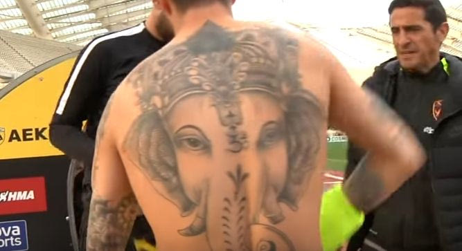 Την ώρα που ο Αργεντινός άσος της Ένωσης άλλαζε μπλούζα για να περάσει στον αγώνα, η κάμερα της ΠΑΕ ΑΕΚ τον κατέγραφε και αποκάλυψε το τατουάζ που καλύπτει ολόκληρη την πλάτη του.