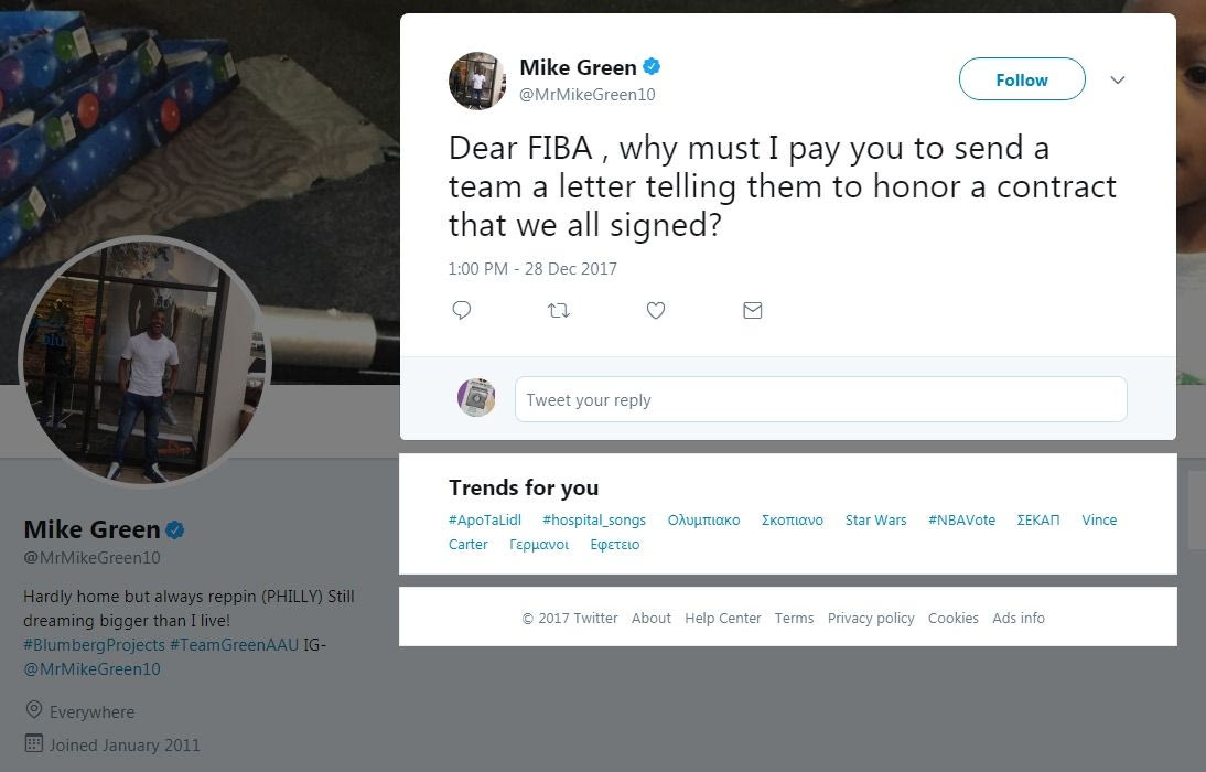 Ο Μάικ Γκριν ανέβασε ένα tweet που προκάλεσε μεγάλη αναστάτωση στο στρατόπεδο της ΑΕΚ. Τι ζητάει από την FIBA, οι αιχμές για το συμβόλαιο και το... ξεκαθάρισμα λίγη ώρα αργότερα.