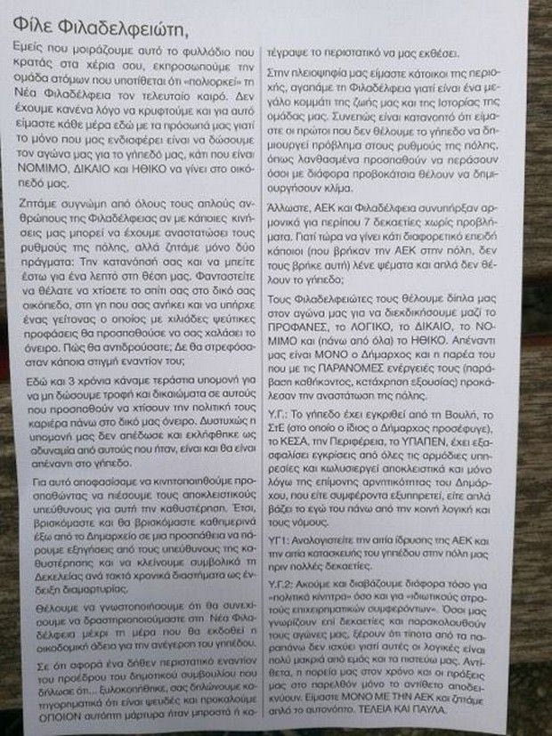 Σε κείμενο 618 λέξεων, που μοιράστηκε πόρτα-πόρτα, οι οπαδοί της ΑΕΚ που συνεχίζουν τις... γηπεδικές κινητοποιήσεις στη Νέα Φιλαδέλφεια και ζητούν από τους δημότες κατανόηση και υποστήριξη, αφού αποκλειστικός στόχος τους είναι "ο Δήμαρχος και η παρέα του".