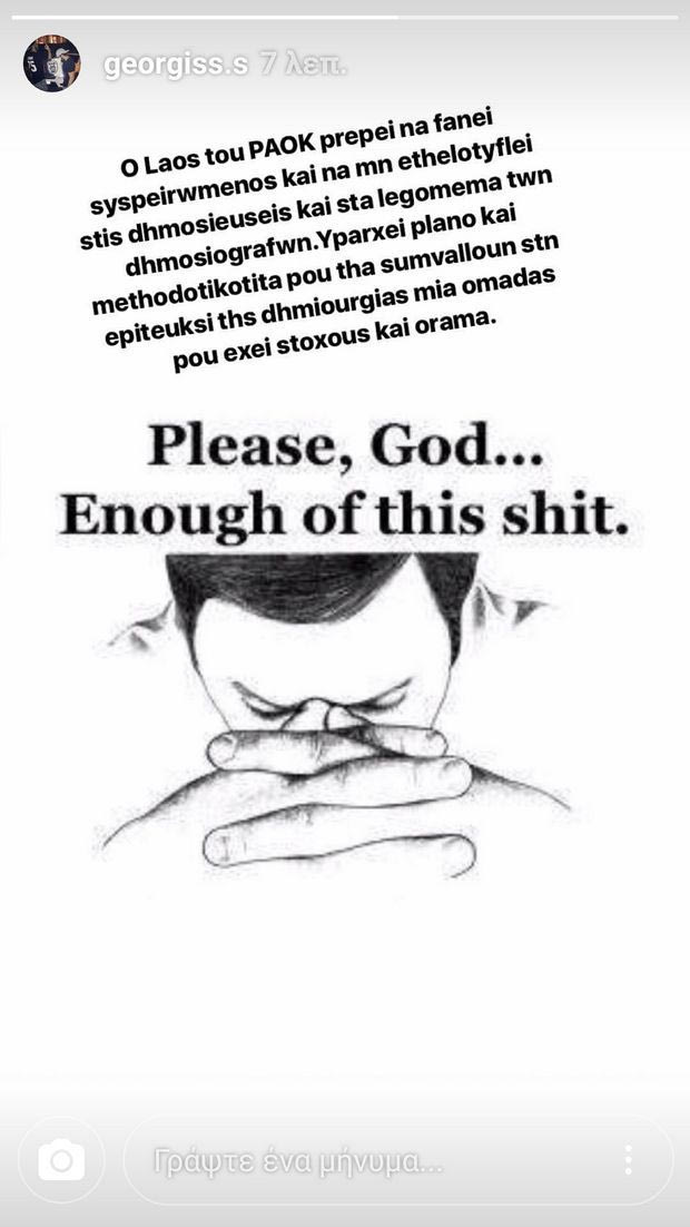 “O λαός του ΠΑΟΚ πρέπει να φανεί συσπειρωμένος και να μην εθελοτυφλεί στις δημοσιεύσεις και στα λεγόμενα των δημοσιογράφων. Υπάρχει πλάνο και μεθοδικότητα που θα συμβάλλουν στη δημιουργίας μιας ομάδας που έχει στόχους και όραμα. Σε παρακαλώ Θεέ μου, αρκετά με αυτά τα σκ…α!”.