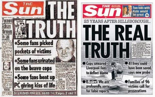 Το πρωτοσέλιδο της ντροπής κυκλοφόρησε στις 19 Απριλίου του 1989, με τον τίτλο (τι ειρωνεία;) “The Truth” (=Η Αλήθεια). Η ‘Sun’, σε ένα όργιο παραπληροφόρησης, κατηγορούσε τους οπαδούς της Λίβερπουλ ότι “έκλεψαν τους νεκρούς, ουρούσαν (!) τους γενναίους αστυνομικούς και κλωτσούσαν τους διασώστες, ενώ πρόσφεραν τις πρώτες βοήθειες στους τραυματίες”.