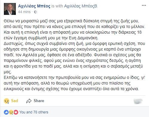 Την ανακοίνωση έκανε ο ίδιος ο κ. Μπέος με ανάρτηση του στο Facebook, θέλοντας έτσι να προστατεύσει την οικογένεια του από τυχόν… κουτσομπολιά.