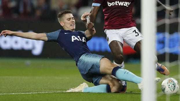 Tottenham Hotspur's Juan Foyth, left, goes to block West Ham United's Michail Antonio shooting at goal during the English League Cup 4th round soccer match between West Ham United and Tottenham Hotspur at the London stadium in London, Wednesday, Oct. 31, 2018. (AP Photo/Alastair Grant) AP