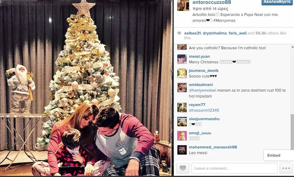 Η σύζυγος του Λιονέλ Μέσι, Αντονέλα Ροκούζο ανέβασε λίγες ώρες μετά το ματς της Μπαρτσελόνα με την Εσπανιόλ, μια φωτογραφία στο instagram στην οποία βρίσκονταν αυτή, ο Μέσι και ο γιος τους, μπροστά από το χριστουγεννιάτικο δέντρο, γράφοντας παράλληλα: