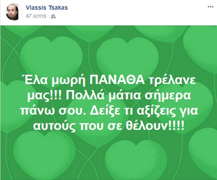 Χαρακτηριστικά έγραψε: “Ελα μωρή Πανάθα, τρέλανέ μας!Πολλά μάτια σήμερα πάνω σου. Δείξε τι αξίζεις σ’ αυτούς που θέλουν”.