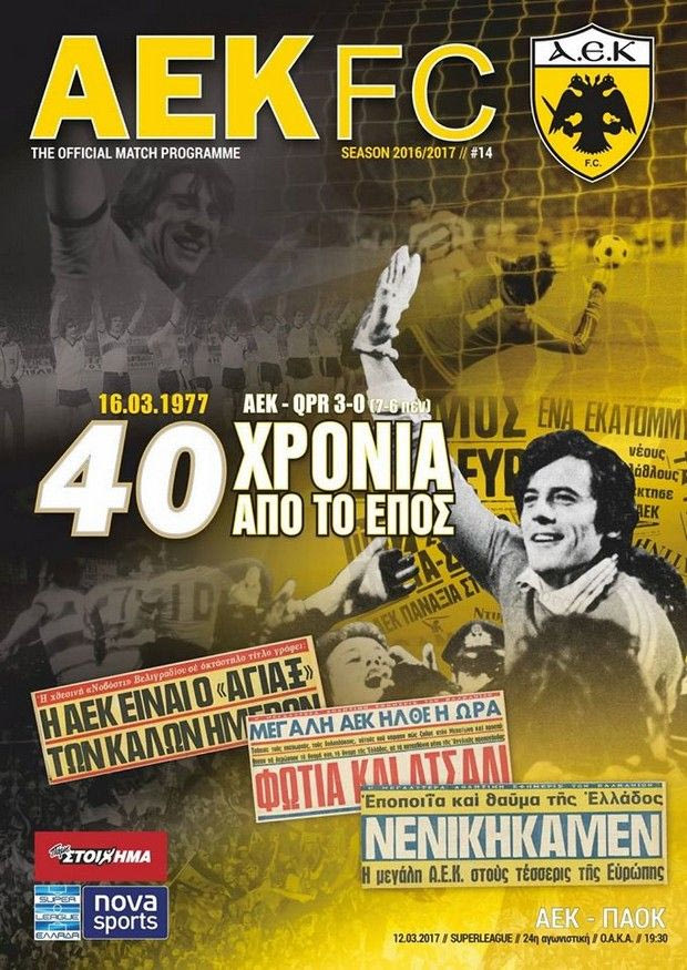 Αφιερωμένη εξ ολοκλήρου στην επέτειο των 40 χρόνων από την πρόκριση στους «4» του Κυπέλλου UEFA της περιόδου 1976-77 που συμπληρώνονται στις 16 Μαρτίου είναι η συλλεκτική έκδοση του official match programme της ΑΕΚ για το ντέρμπι της Κυριακής με τον ΠΑΟΚ, όπως ανακοίνωσε η “κιτρινόμαυρη” ΠΑΕ.