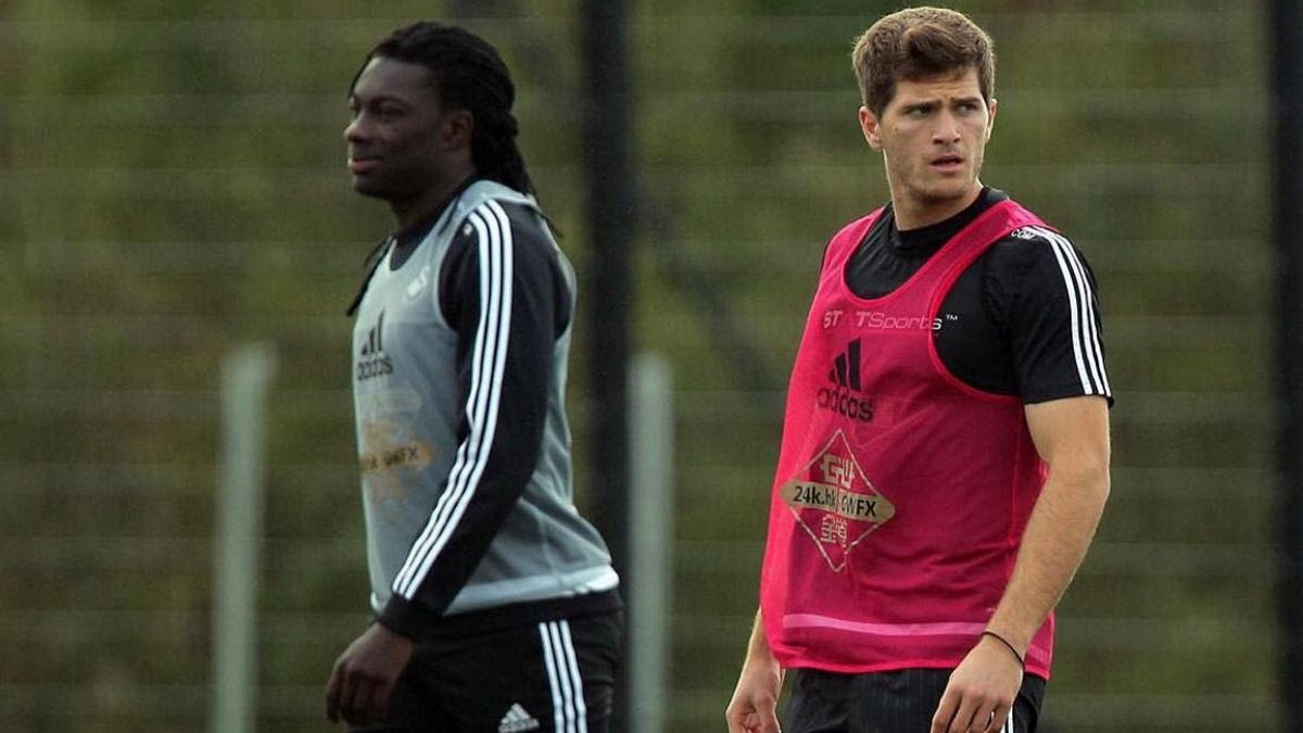 Ο Άλεξ Γκόγκιτς στην προπόνηση της Σουόνσι, παρέα με τον Γάλλο διεθνή στράικερ Μπαφετιμί Γκομίς.