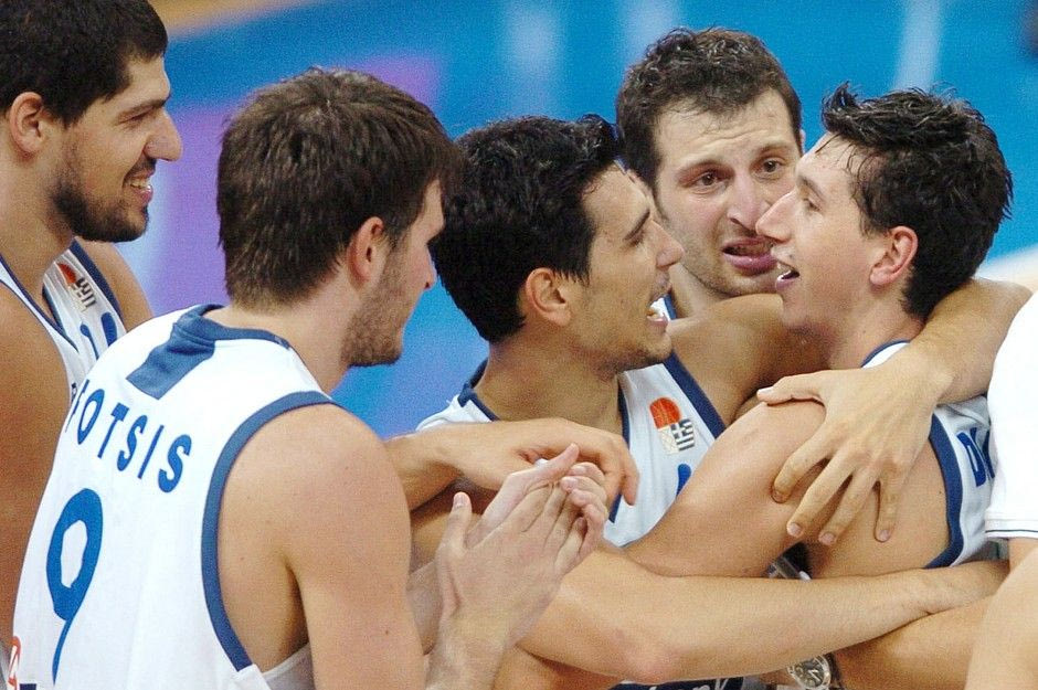 Ο Δημήτρης Διαμαντίδης στις αγκαλιές των συμπαικτών του μετά το νικητήριο τρίποντο στον ημιτελικό του Ευρωμπάσκετ, απέναντι στη Γαλλία, στις 24 Σεπτεμβρίου 2005 Eurokinissi