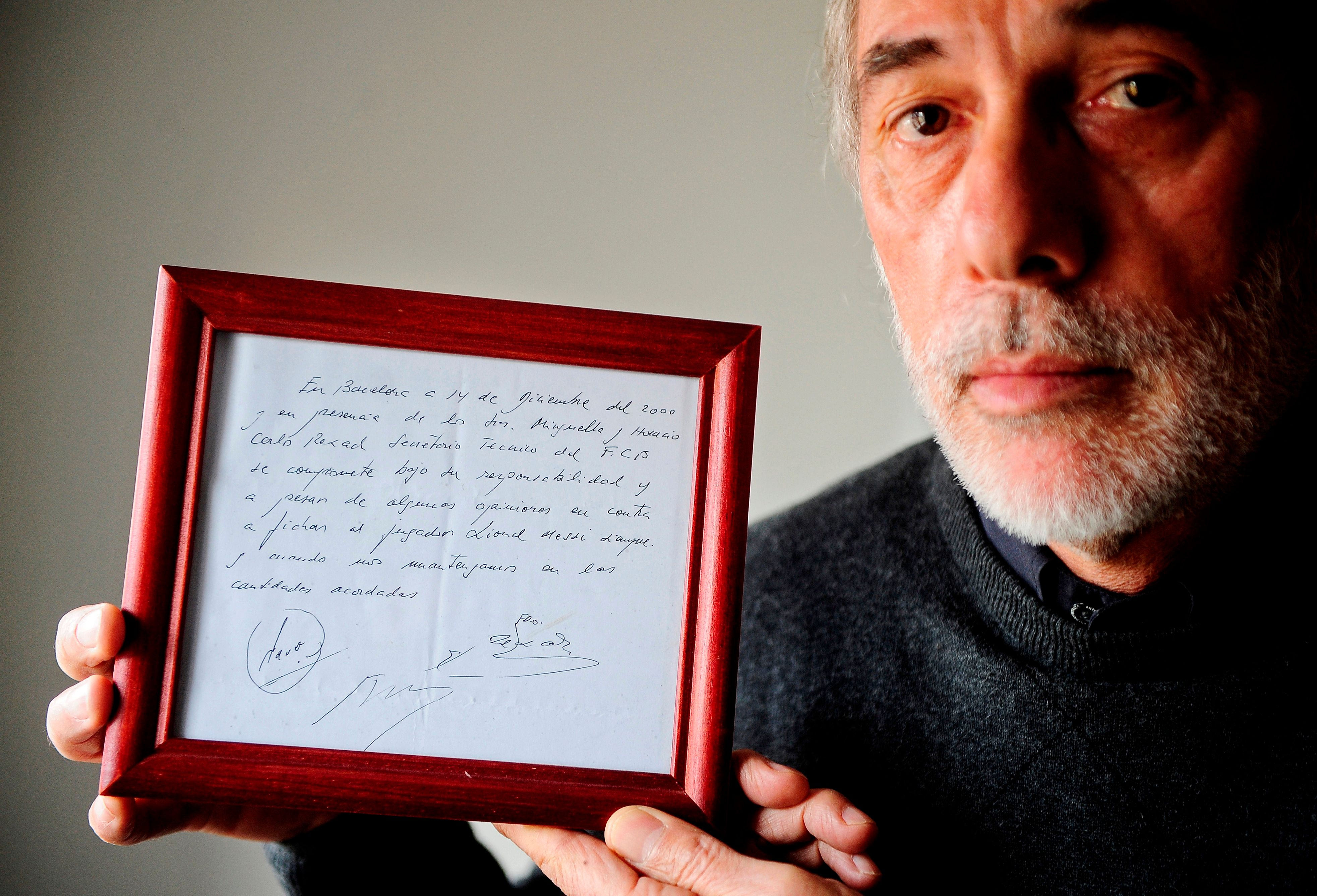 C.R.: Θα μπορούσα να πω ότι η χαρτοπετσέτα είναι μάλλον το σημαντικότερο “έγγραφο” που έγραψα και υπέγραψα σε όλη την επαγγελματική διαδρομή μου. Και ναι, προφανώς και θυμάμαι: “Στη Βαρκελώνη, στις 14 Δεκεμβρίου του 2000 και παρουσία των κυρίων Μινγκέγια και Γκατσιόλι, ο Κάρλες Ρεσάκ, τεχνικός γραμματέας της Μπαρτσελόνα, δεσμεύεται υπ’ ευθύνη του και παρά το γεγονός ότι υπάρχουν κάποιες αντίθετες γνώμες, να προσφέρει συμβόλαιο στον παίκτη Λιονέλ Μέσι, πάντα και εφόσον τηρηθούν τα συμφωνημένα ποσά”.