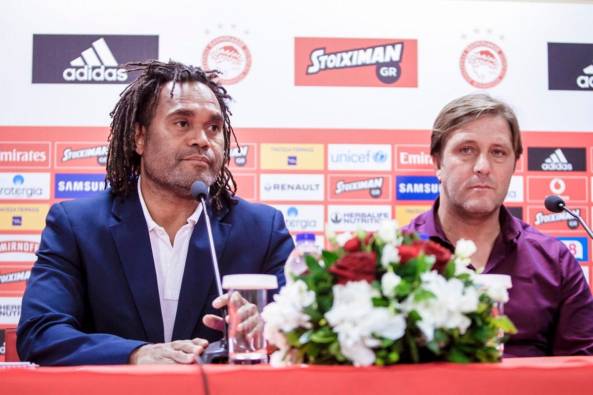 Ο αθλητικός διευθυντής της ΠΑΕ Ολυμπιακός, Κριστιάν Καρεμπέ, στην παρουσίαση του νέου προπονητή της ομάδας, Πέδρο Μαρτίνς στα γραφεία της πλατείας Αλεξάνδρας | Τρίτη 8 Μαΐου 2018 Eurokinissi Sports/Κλοντιάν Λάτο