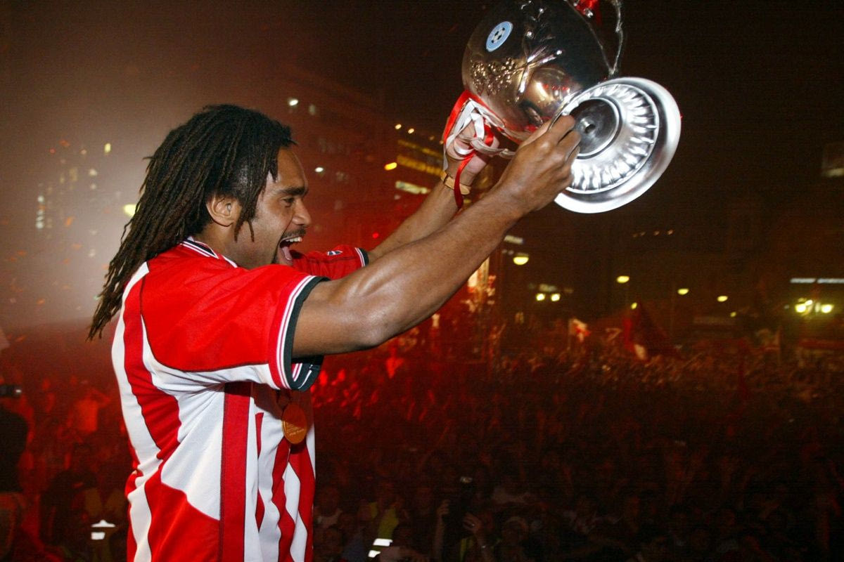 Ο Κριστιάν Καρεμπέ του Ολυμπιακού πανηγυρίζει την κατάκτηση του πρωταθλήματος Α' Εθνικής 2002-2003 στον Πειραιά | Παρασκευή 30 Μαΐου 2003 Eurokinissi Sports