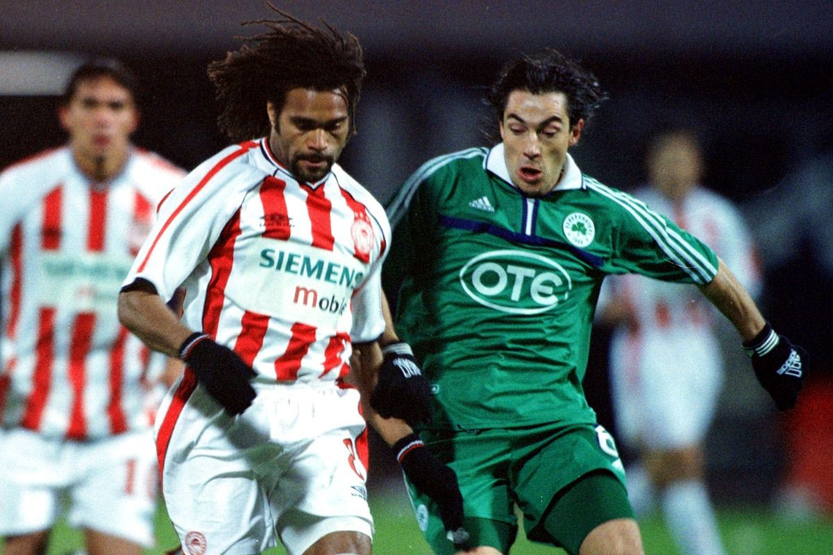 Ο Κριστιάν Καρεμπέ του Ολυμπιακού μονομαχεί με τον Πάουλο Σόουζα του Παναθηναϊκού σε αναμέτρηση για την Α' Εθνική 2001-2002 στο Ολυμπιακό Στάδιο | Σάββατο 1 Δεκεμβρίου 2001 Eurokinissi Sports